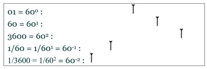 Chaque colonne correspond ainsi à une puissance de 60 (tout comme dans un nombre en chiffre arabes, le rang correspond à une puissance de 10 : la notation « 362 » signifie 3 x 102 + 6 x 101 + 2 x 100).