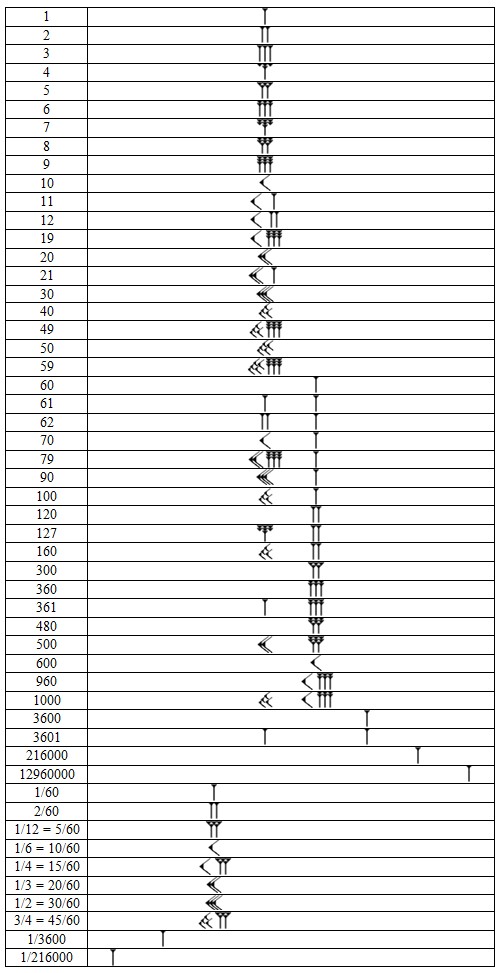 Encore plus sidérant : pour les nombres, seuls les deux derniers signes étaient utilisés... Strictement rien d'autre. C'est déjà impressionnant quand on est en binaire mais les Babyloniens avaient réussi à se contenter de deux signes pour un système intégrant à la fois la base 10 et la base 60, ce qui est sans doute encore plus impressionnant, comme nous le verrons plus en détail.