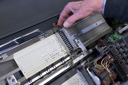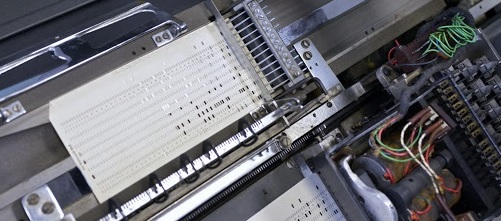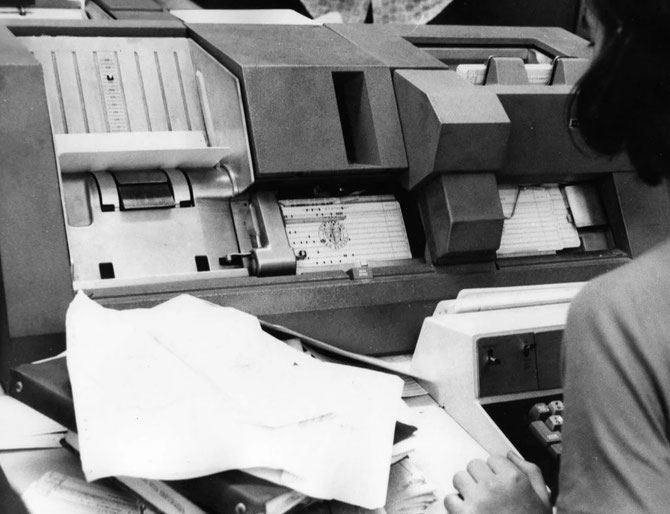 Perforatrice (c’est le nom de la machine mais aussi de l’opératrice) de cartes perforées.