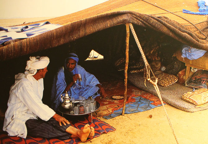 Un nomade buvant un thé à la menthe avec un visiteur sous sa tente.