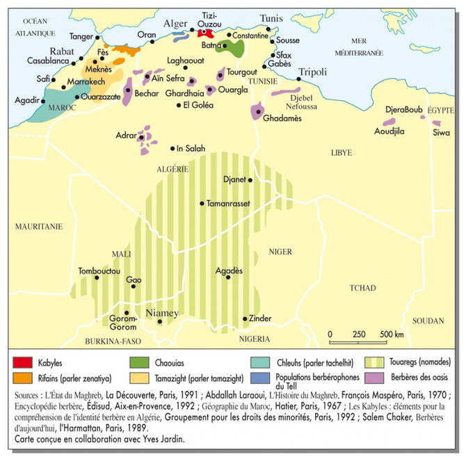 Les Berbères (ou Imazighen dans leur langue : le tamazight, qui compte bien sûr de nombreuses variantes dialectales – totalement distinctes de l'arabe dialectal bien sûr) sont présents dans le nord de l'Afrique (pas seulement au Maghreb) depuis plusieurs millénaires. On les trouve aujourd'hui principalement en Algérie, au Maroc, en Lybie mais aussi au Mali et au Niger (ainsi qu'en France, en Belgique et aux Pays-Bas suite à des migrations plus récentes). Il s'agit plus précisément des Kabyles, des Chaouis, des Mozabites et des Zénètes en Algérie, des Rifains, des Chleuhs et des Zayanes au Maroc – pour ne citer que les peuples les plus nombreux ou les plus connus. À côté de ces sédentaires, des nomades, les Touaregs, sont présents en Algérie, en Lybie, au Mali, au Niger et au Burkina Faso. Nous y reviendrons.