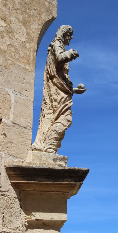 avec une main qui tient un globe terrestre et l'autre qui bénit)