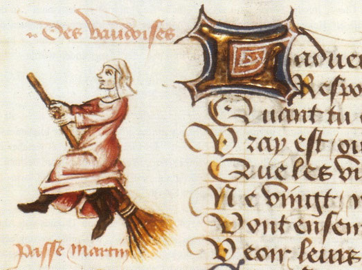 Sorcière volant sur un balai, dans un manuscrit de 1451 (Le Champion des dames