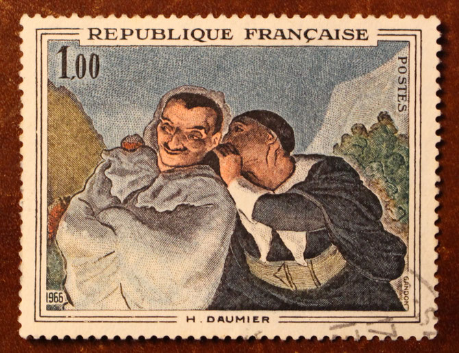 Un timbre de la Poste française (gravé par Pierre Gandon en taille douce en 1966) représentant une huile sur toile (exposée au Musée d'Orsay à Paris) peinte par Honoré Daumier vers 1864 : Crispin et Scapin (dit aussi Scapin et Silvestre car Daumier faisait référence à la pièce de Molière : Les Fourberies de Scapin). L'artiste a visiblement accordé beaucoup d'importance à la physionomie, révélatrice selon lui de la nature même des personnages : la forme des deux nez est sans doute considérée comme révélatrice de leur caractère fourbe (c'est-à-dire rusé, perfide et trompeur)... © 2021 C. Rubin. Tous droits réservés.