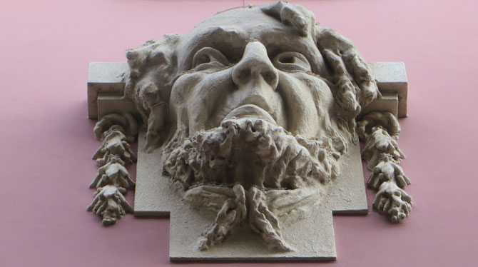 Un mascaron sur un mur du Théâtre national São João à Porto. © 2019 C. Rubin. Tous droits réservés.