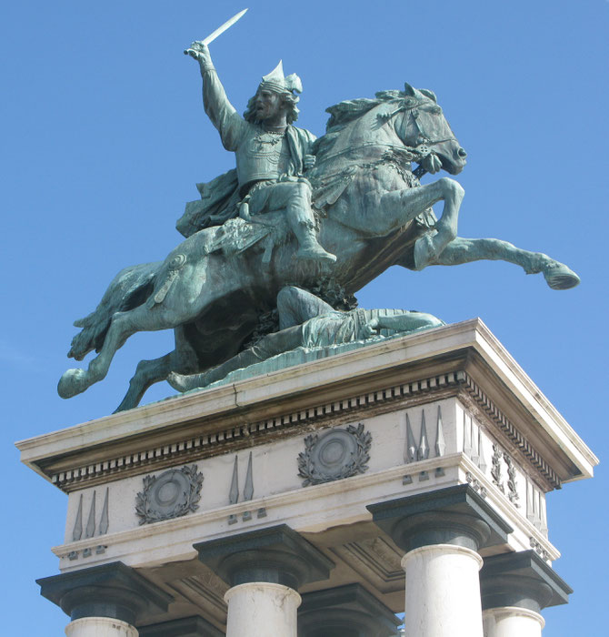 Le monument à Vercingétorix sur la place de Jaude à Clermont-Ferrand : une grandiose statue équestre du sculpteur Auguste Bartholdi et un exemple de langage du mythe puisqu'elle a été inspirée par le roman national promu par Napoléon III pour valoriser sa propre histoire personnelle et familiale (sans le moindre rapport objectif puisque la France n'a commencé à exister qu'un millénaire après Vercingétorix et que la famille Bonaparte était étrangère à l'ethnie celte, à sa langue et à sa culture, tout comme un précédent empereur, Charlemagne, qui appartenait au monde germanique mais qui a été intégré malgré tout dans le roman national français. © 2014 C. Rubin. Tous droits réservés.